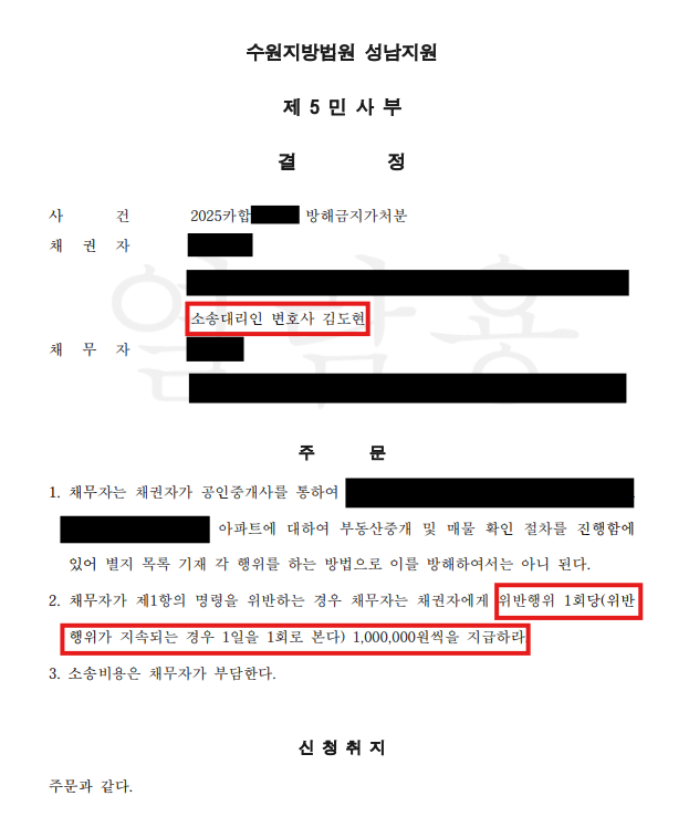 이에 따라, 단순히 매각 방해를 금지하는 것에 그치지 않고, 위반 시 위약금(간접강제금) 1회당 100만 원을 청구했습니다.